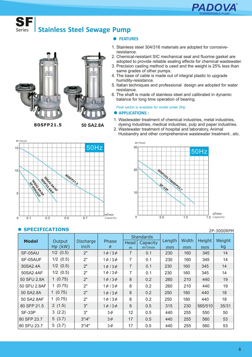 Padova Submersible Pump Type SF , pompa celup stainless steel untuk air bersih maupun kotor , yang bersifat korosif. Pompa ini bisa digunakan untuk Restoran, Pabrik, Industri pengolahan makanan, Industri pengolahan ikan, Industri Kimia, Rumah sakit, dll. Pompa ini mampu menghasilkan Head yang cukup tinggi.
