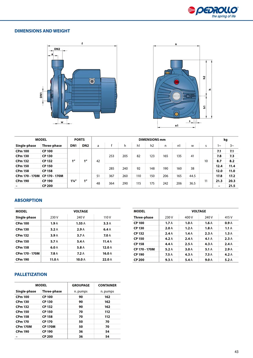 Pompa Pedrollo Type CP adalah pompa air centrifugal untuk air bersih, Yang digunakan untuk Mentransfer air yang tidak bersifat korosif , tidak mengandung lumpur atau pasir dari bak penampungan air atau kolam penampungan air.